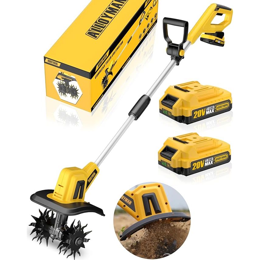 Alloyman 20V Cordless Tiller Cultivator,360RPM Electric Garden Tiller, with 2 * 2.0Ah Batteries & Charger,9In Tilling Width, 6.6In Depth Garden Rototiller for Lawn/Gardening/Soil Cultivation