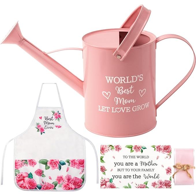 Surprise your mom with the perfect gardening gift set that includes a pink metal watering can and a stylish rose-patterned apron. This set exudes a strong gardening vibe and comes with a beautiful card for you to write your best wishes for mom. The metal watering can is made of high-quality steel with a durable pink finish, holding approximately 1.6 liters of water for indoor and outdoor plants.