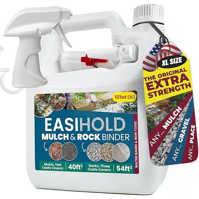 EASIHOLD is a landscaping solution that includes a spray for easy application. The 101oz mulch and rock glue is designed to stabilize mulch, rocks, and pea gravel for up to 3 years. The product is non-toxic, ready to use, and dries quickly, making it a convenient and effective option for landscaping projects.