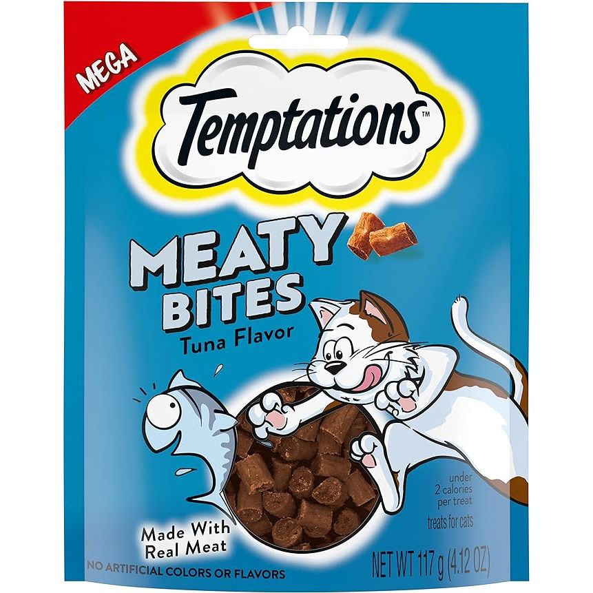 TEMPTATIONS Meaty Bites are soft and savory cat treats that come in a tuna flavor. These treats are available in a 4.12 oz. pouch, making them ideal for rewarding your feline friend or for use as a special treat. Made with real tuna as the first ingredient, these treats are sure to satisfy your cat's cravings for meaty flavors.