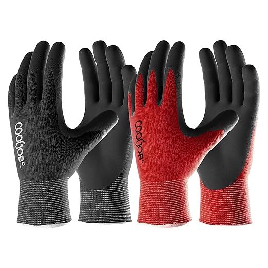 The COOLJOB Gardening Gloves for Men come in a pack of 6 pairs, making them a convenient option for outdoor work such as weeding, landscaping, and yard maintenance. These gloves are designed with a breathable rubber coating that provides protection and grip while allowing for airflow to prevent moisture build-up. The gloves are sized for men's large hands and come in a sleek black and red color scheme.