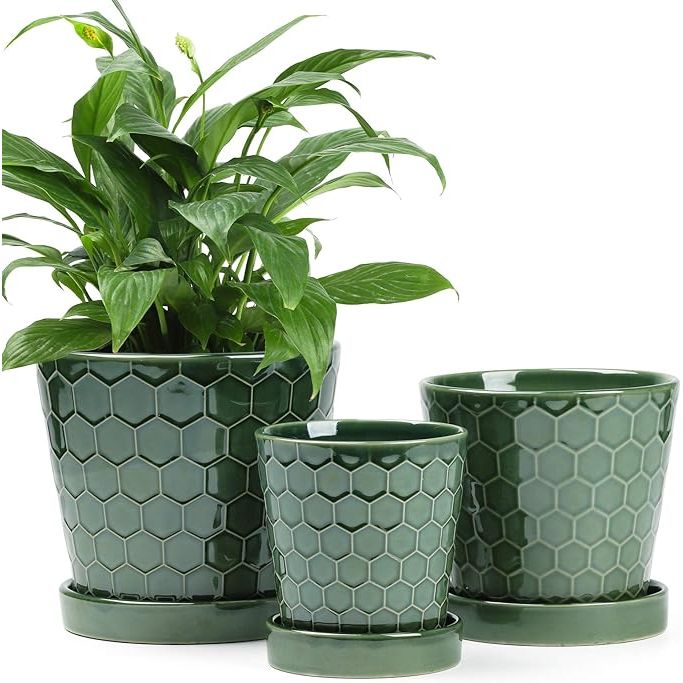 The Ceramic Plant Pot set includes three pots measuring 4, 5, and 6 inches in diameter, along with matching drainage trays. The pots are made of high-quality ceramic and have a stylish patina finish, making them suitable for decorating any home, office, or windowsill. The included drainage holes help prevent overwatering and root rot, making them ideal for planting a variety of indoor plants or flowers.