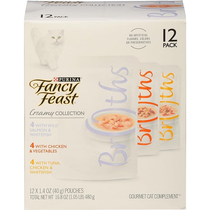 Purina Fancy Feast Lickable Broth Topper Complement Creamy Wet Cat Food Variety Pack is a pack of 12 individual 1.4 oz pouches of creamy wet cat food. These pouches serve as complements to your cat's regular diet, providing a flavorful and indulgent treat for your feline friend. The broths are made with high-quality ingredients and come in a variety of flavors to suit your cat's preferences.