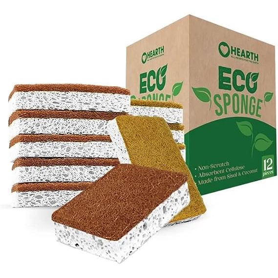 Hearth Eco Friendly Sponges for Kitchen Dishes, Pots, Pans, and Non-Abrasive Surface Cleaning, 12 Pack, Natural, Plant-Based, and Biodegradable Wood Pulp, Coconut and Sisal Fibers
