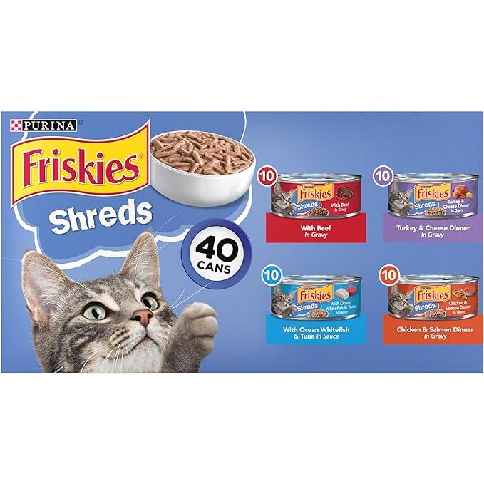 Purina Friskies Wet Cat Food Variety Pack, Shreds Beef, Turkey, Whitefish, and Chicken & Salmon - (Pack of 40) 5.5 oz. Cans