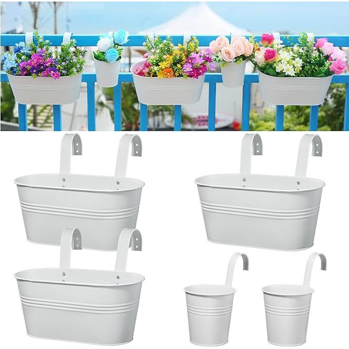 The 5 Pcs Hanging Planter Railing Planter Box is a set of five metal iron window boxes designed for outdoor plants. The planters are a sleek matte white color, making them a stylish addition to any balcony or fence. The planters have detachable hooks, allowing for easy installation and repositioning as desired.