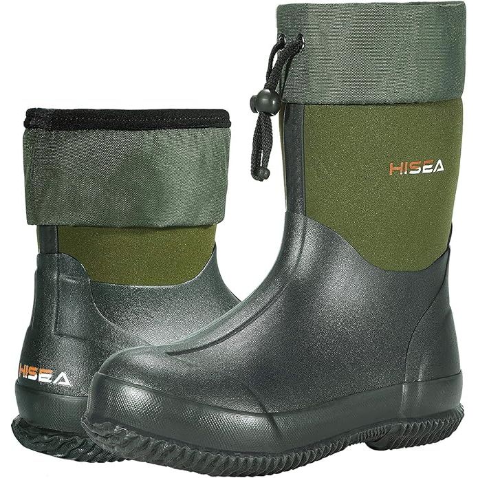 Overall, HISEA Men's Rain Boots are a practical and reliable choice for anyone in need of a sturdy and comfortable pair of rain boots. Whether you're working in the garden, going for a hike, or simply need a durable pair of boots for rainy days, these waterproof neoprene rubber boots are a versatile and dependable option. Description by ChatGPT.
